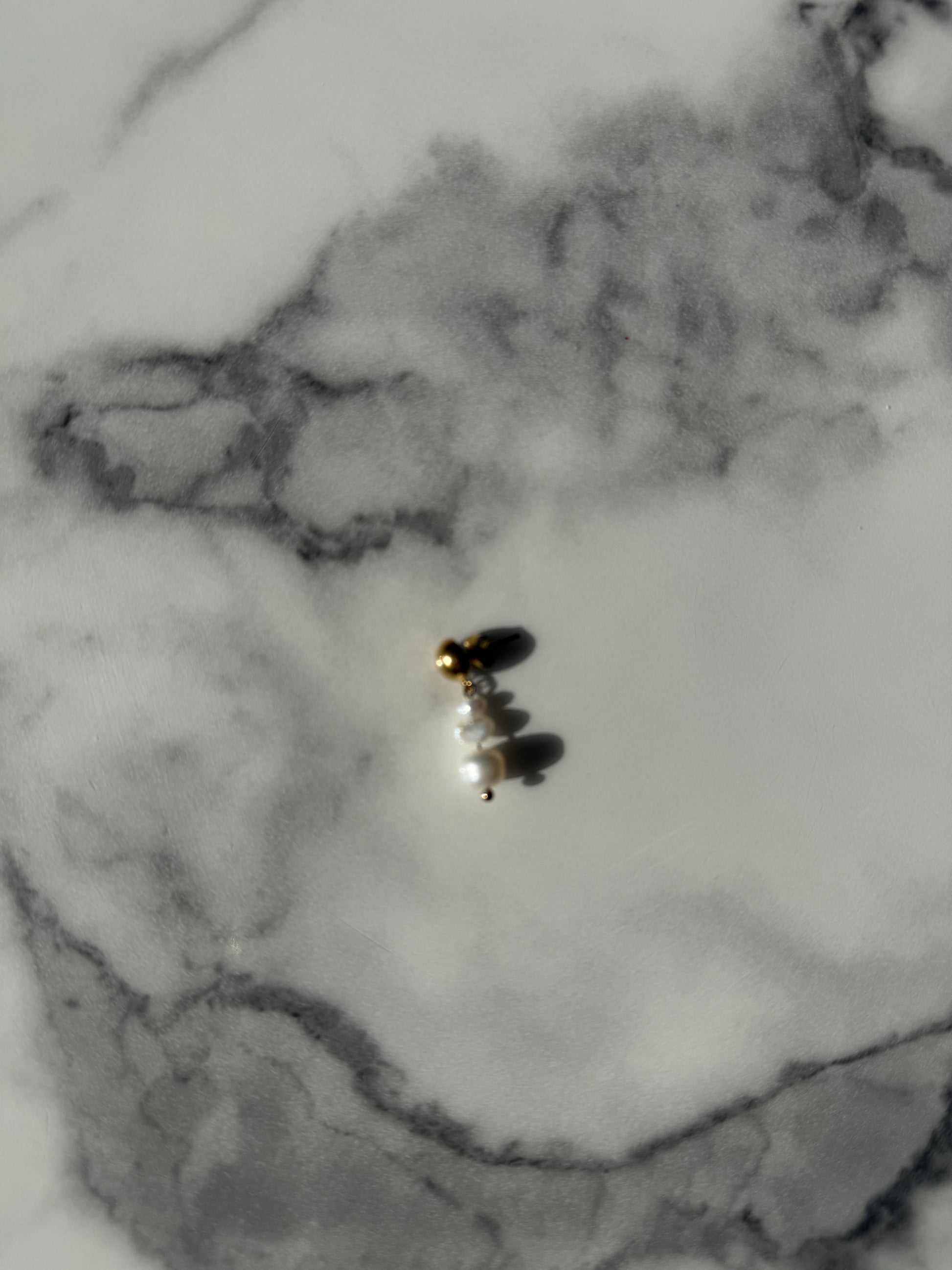 Boule dorée fine, montée d’un pendentif délicat composé de trois perles d’eau douce, de tailles différentes.
