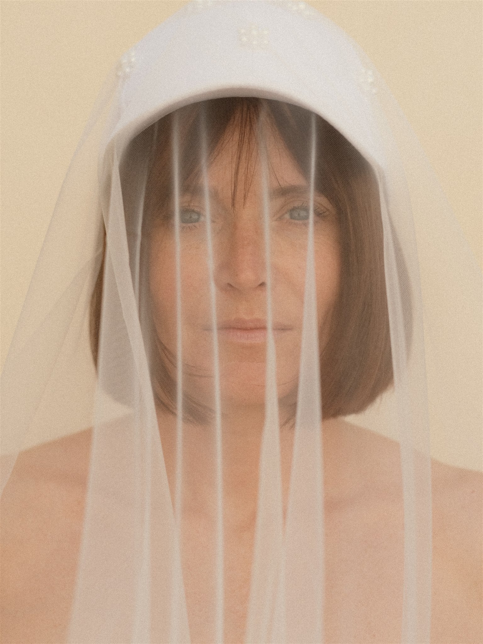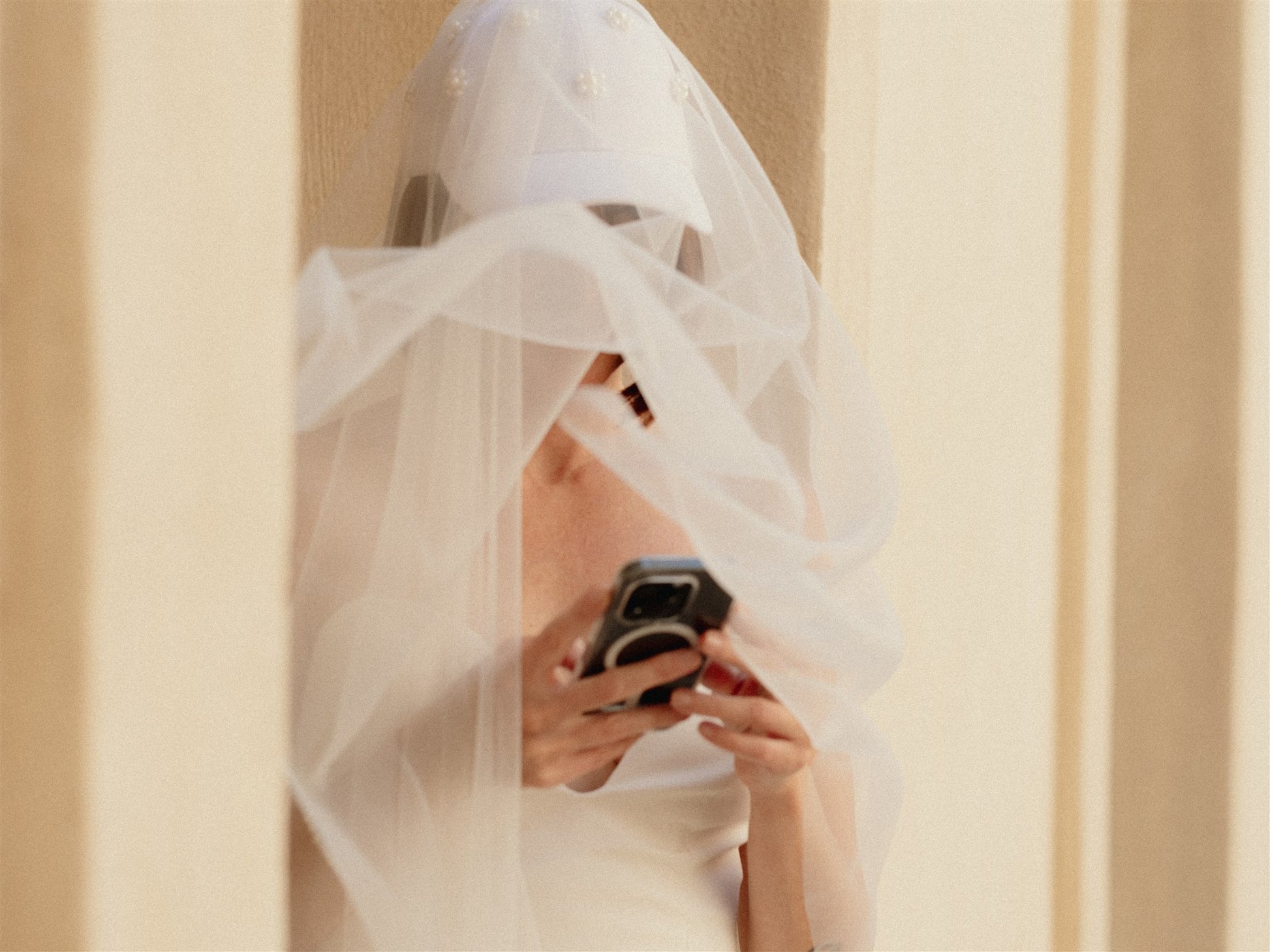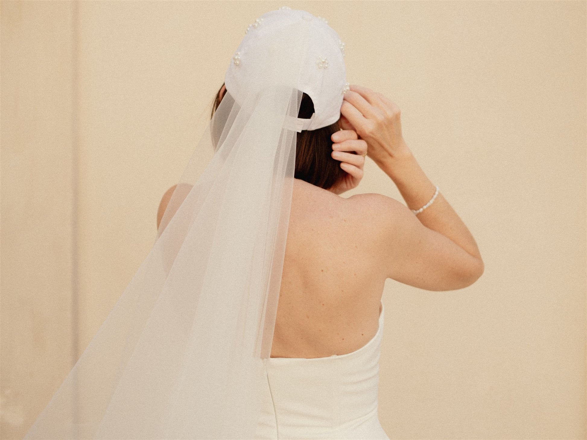 Un voile léger, fixé à la casquette, descend jusqu’aux coudes.