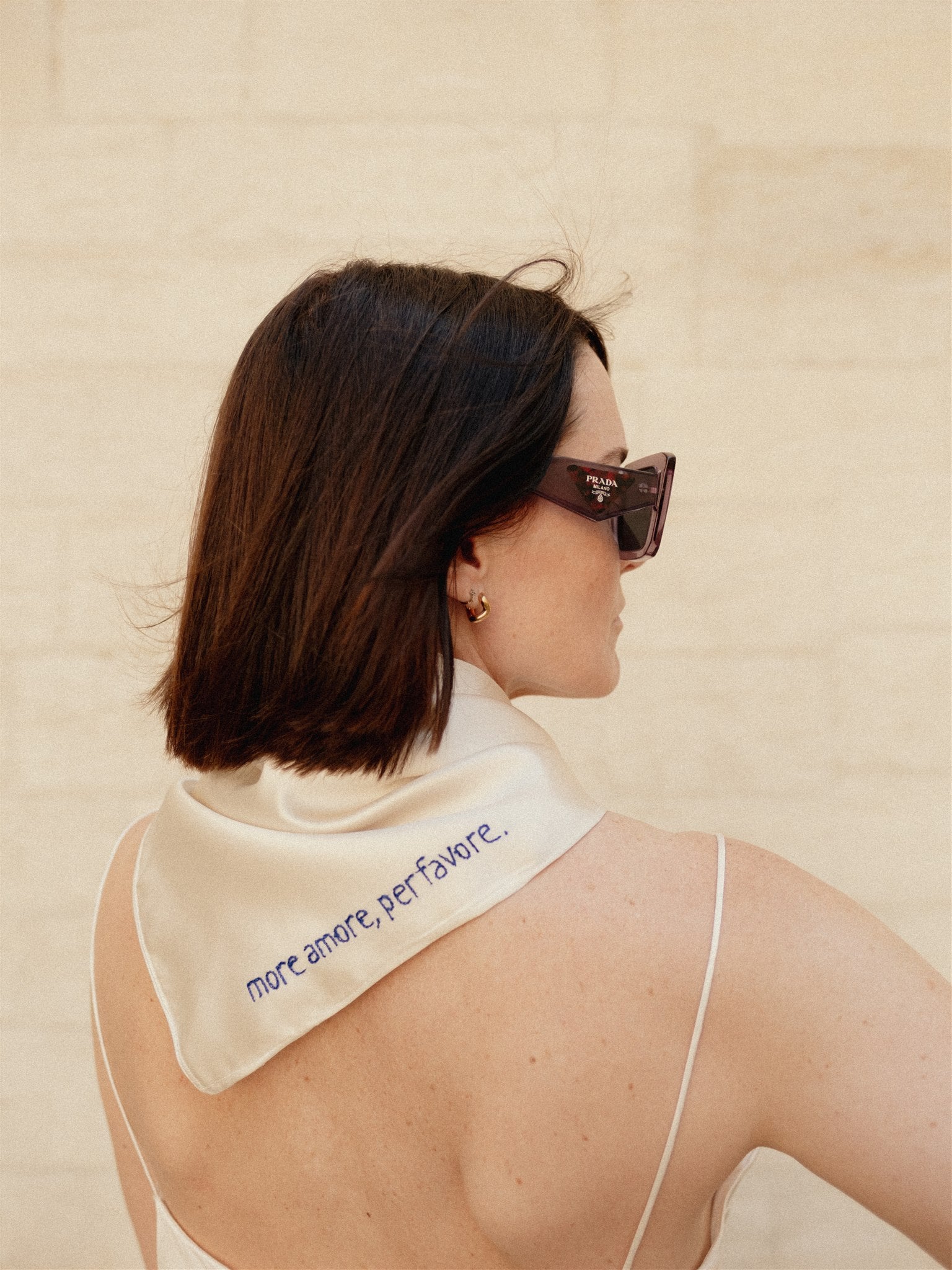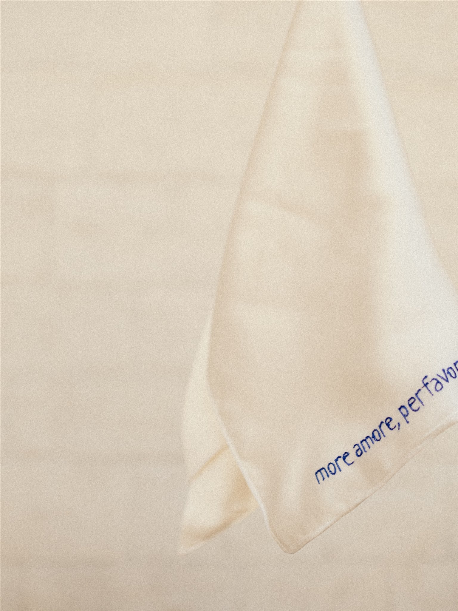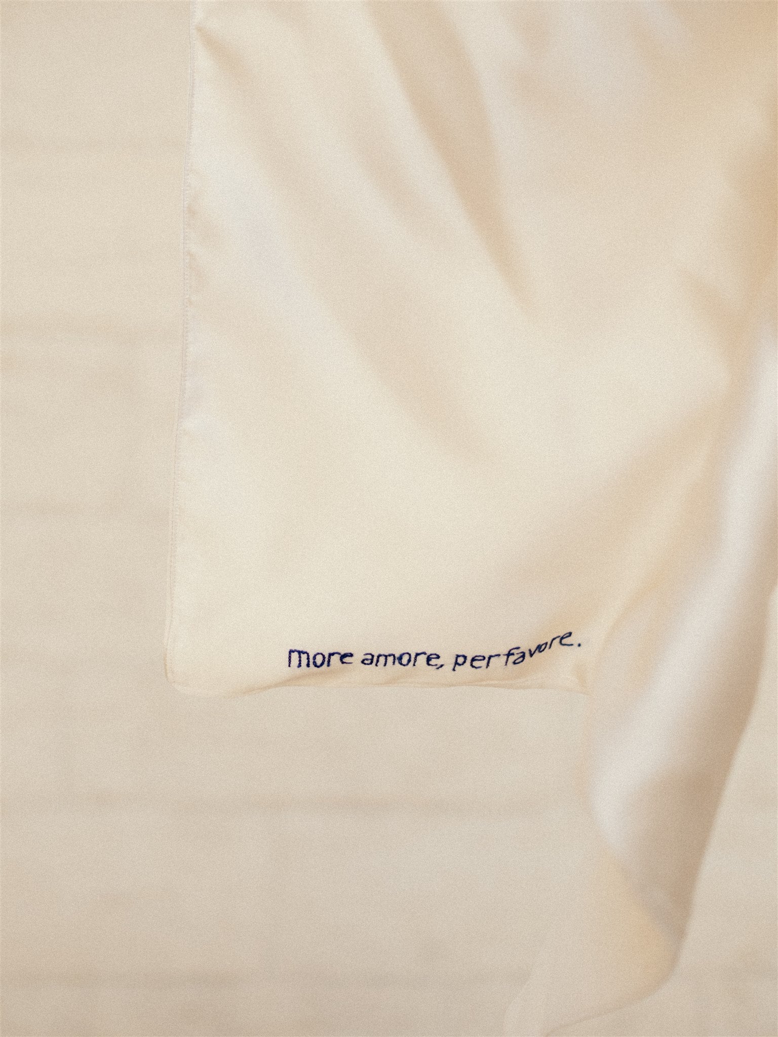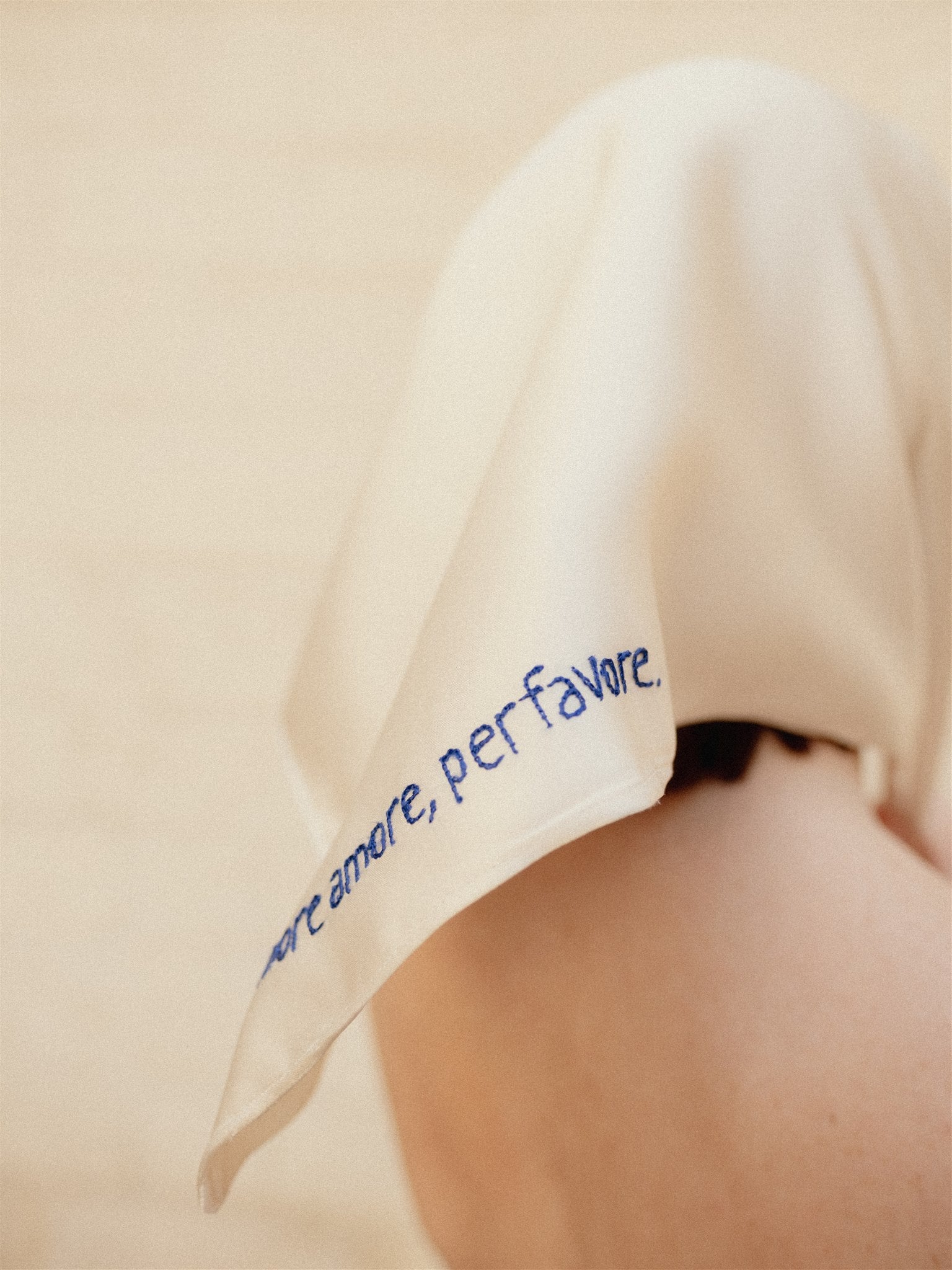 Broderie délicate en bleu : « more amore per favore », un petit mantra d’amour à porter près de soi.