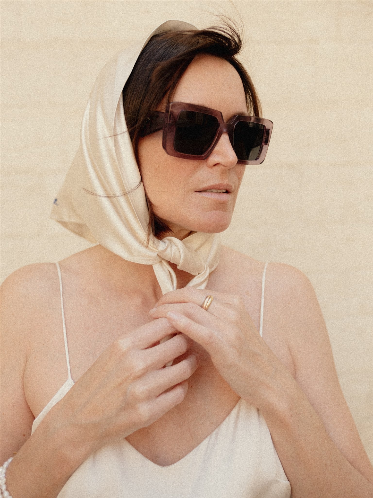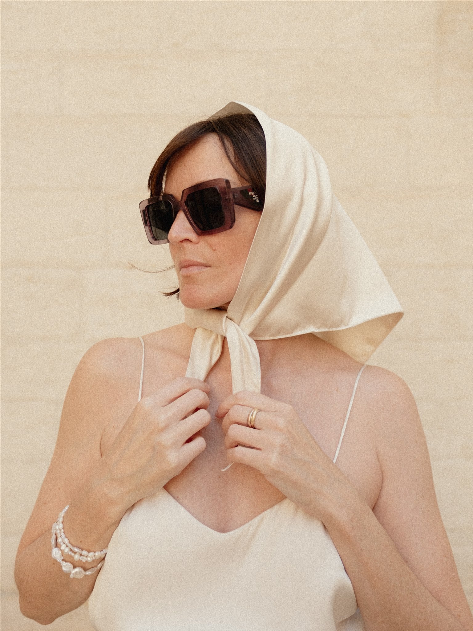 Satin duchesse doux et brillant, coupé pour se porter autour de la tête ou du cou, façon vintage années 50.