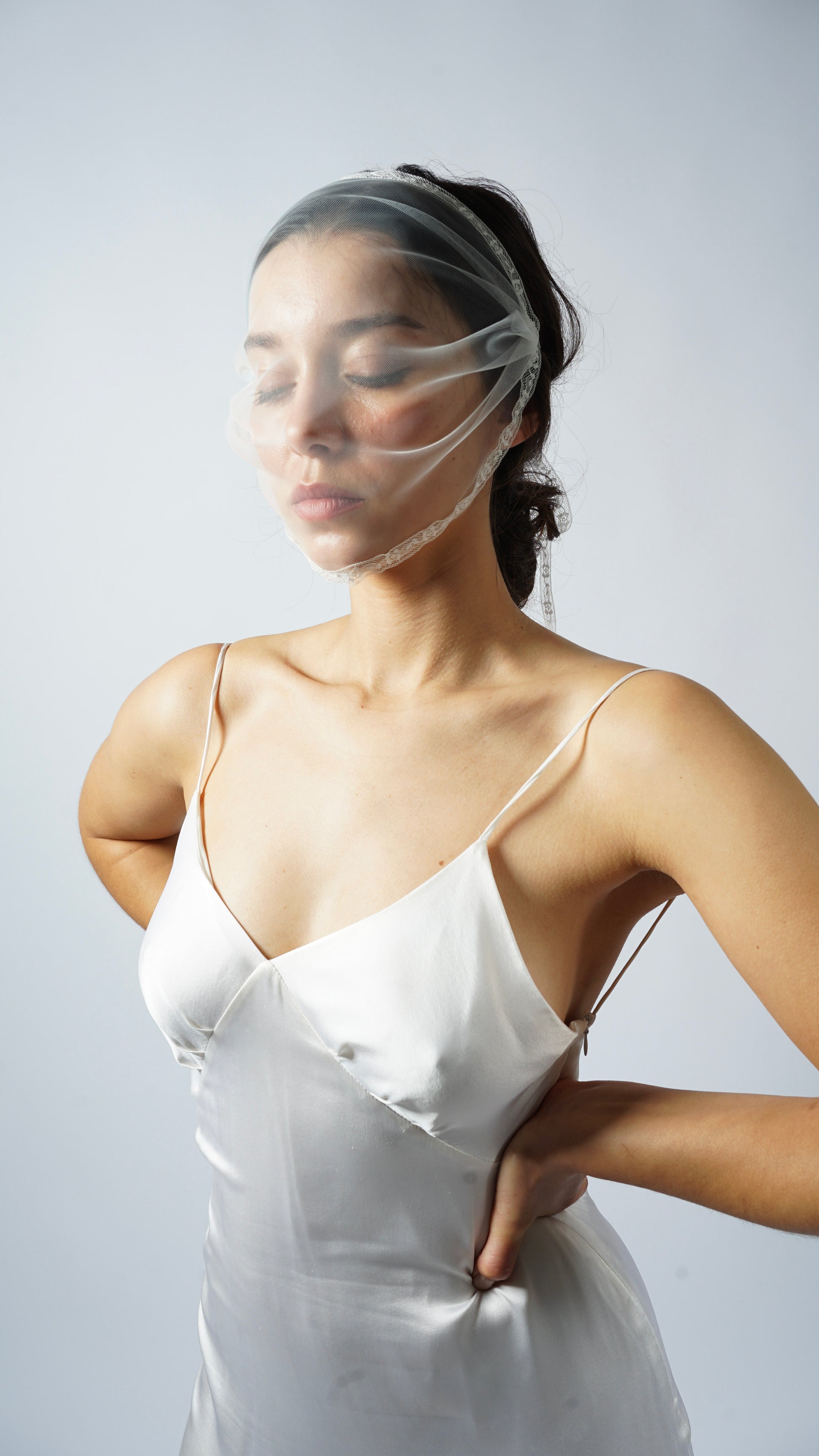 Un accessoire résolument audacieux, conçu pour la mariée qui ose redéfinir les codes. Le masque "The Absolute" n'est pas qu'un voile, c'est une pièce qui intrigue, protège et révèle à la fois, enveloppant le visage d'une aura de mystère et de sophistication.