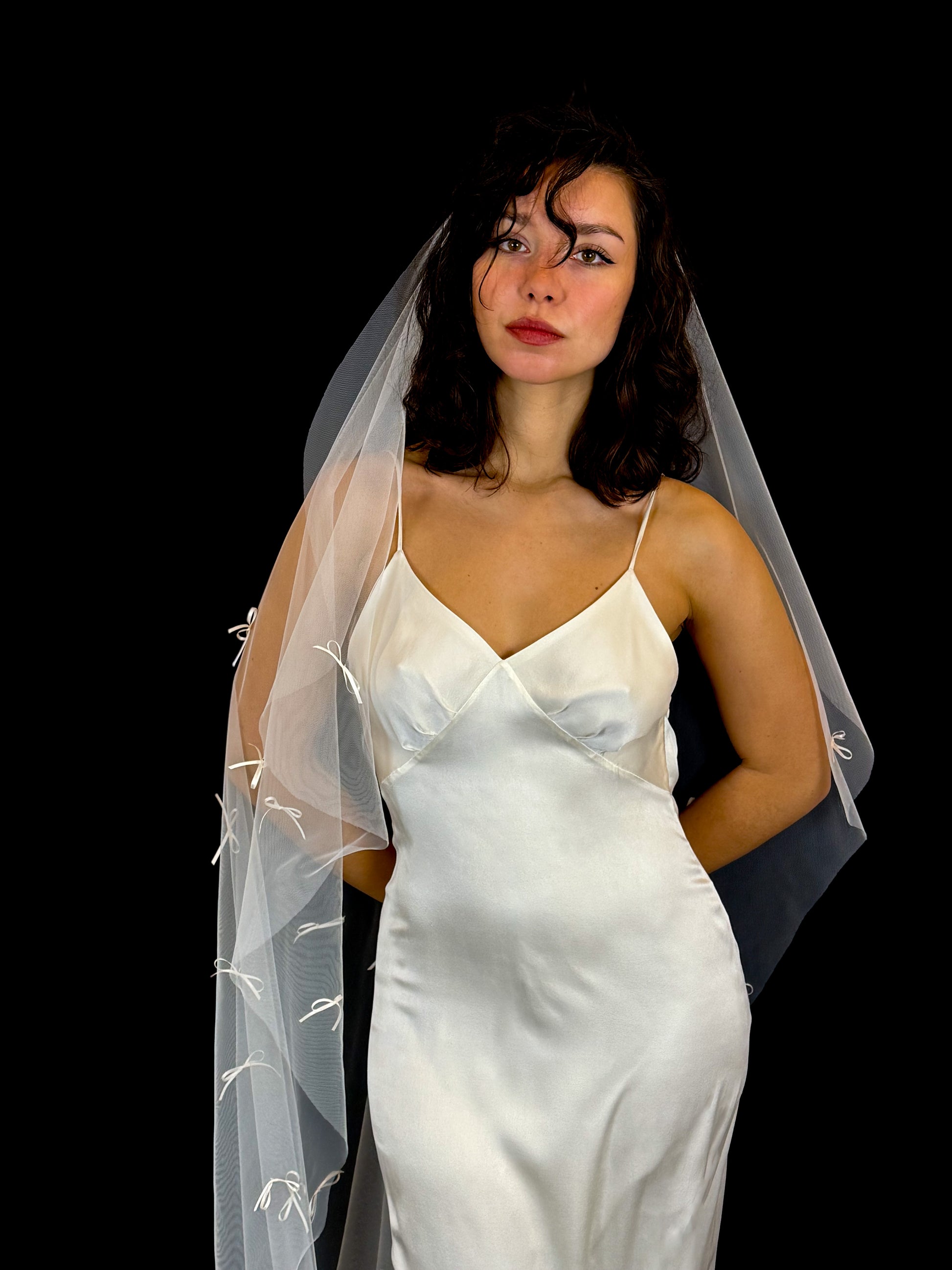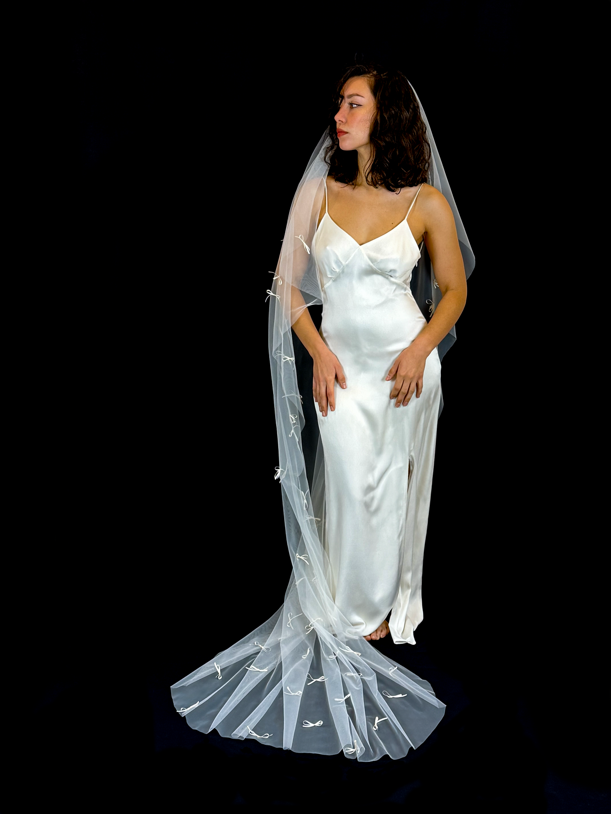 Ce voile de mariée longueur chapelle (2m30) rend hommage à l’élégance intemporelle de Michelle Pfeiffer. Confectionné artisanalement en France, il mêle minimalisme et poésie, avec de délicats nœuds de satin cousus à la main.