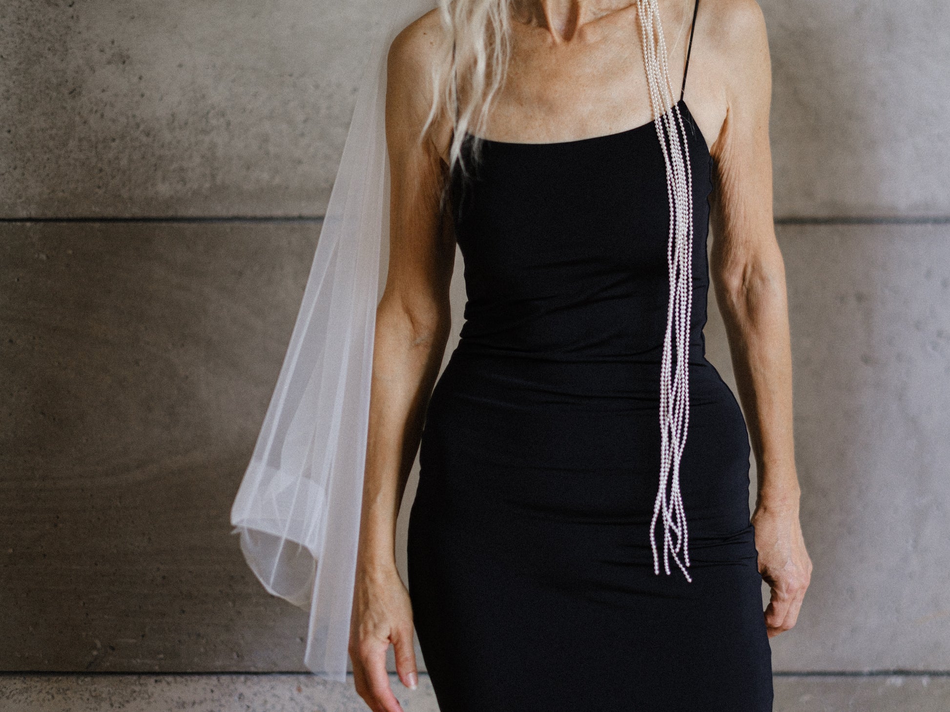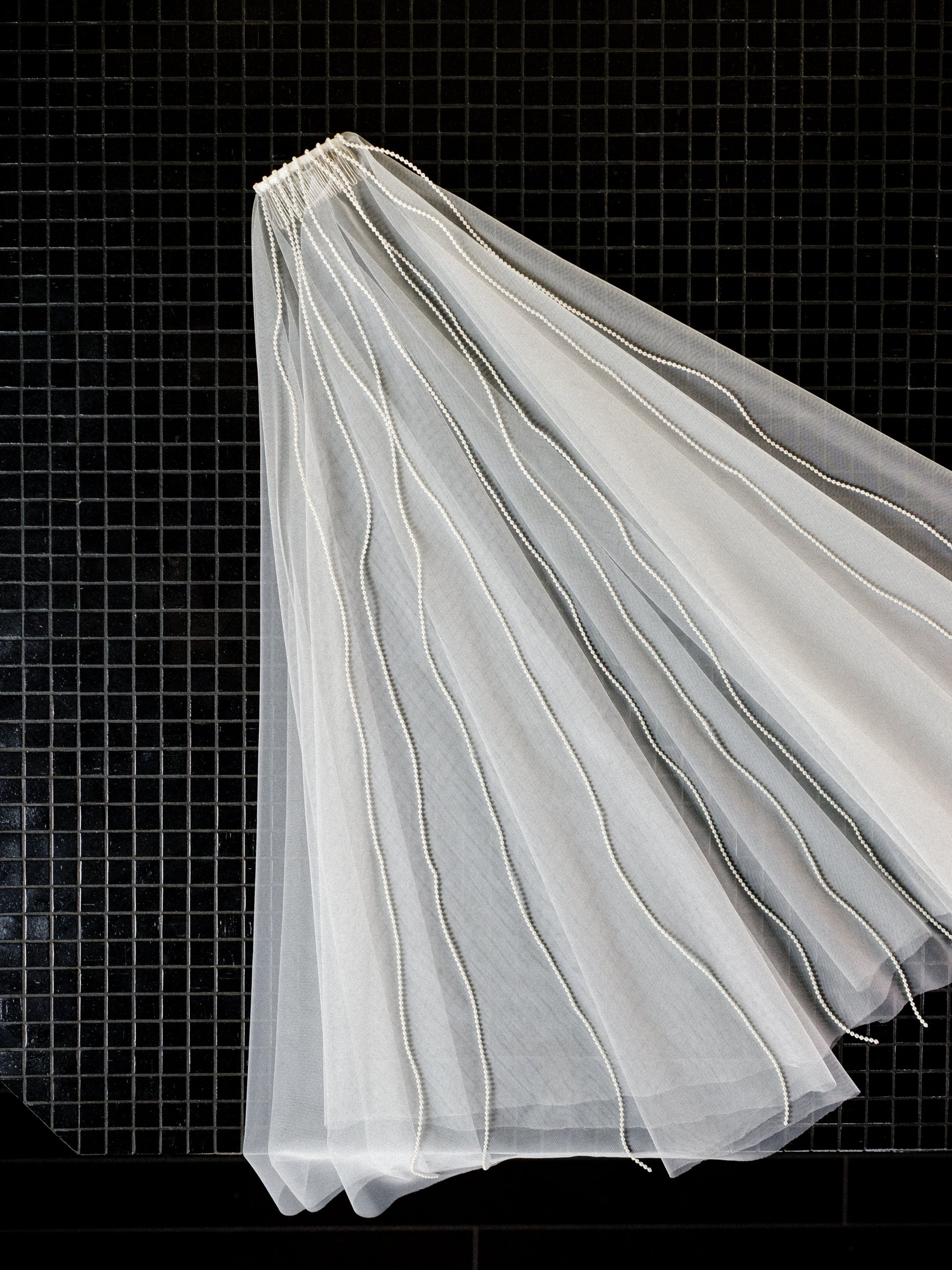 Du tulle léger et une ligne de perles nacrées : le voile No Lace incarne l’élégance sans superflu.