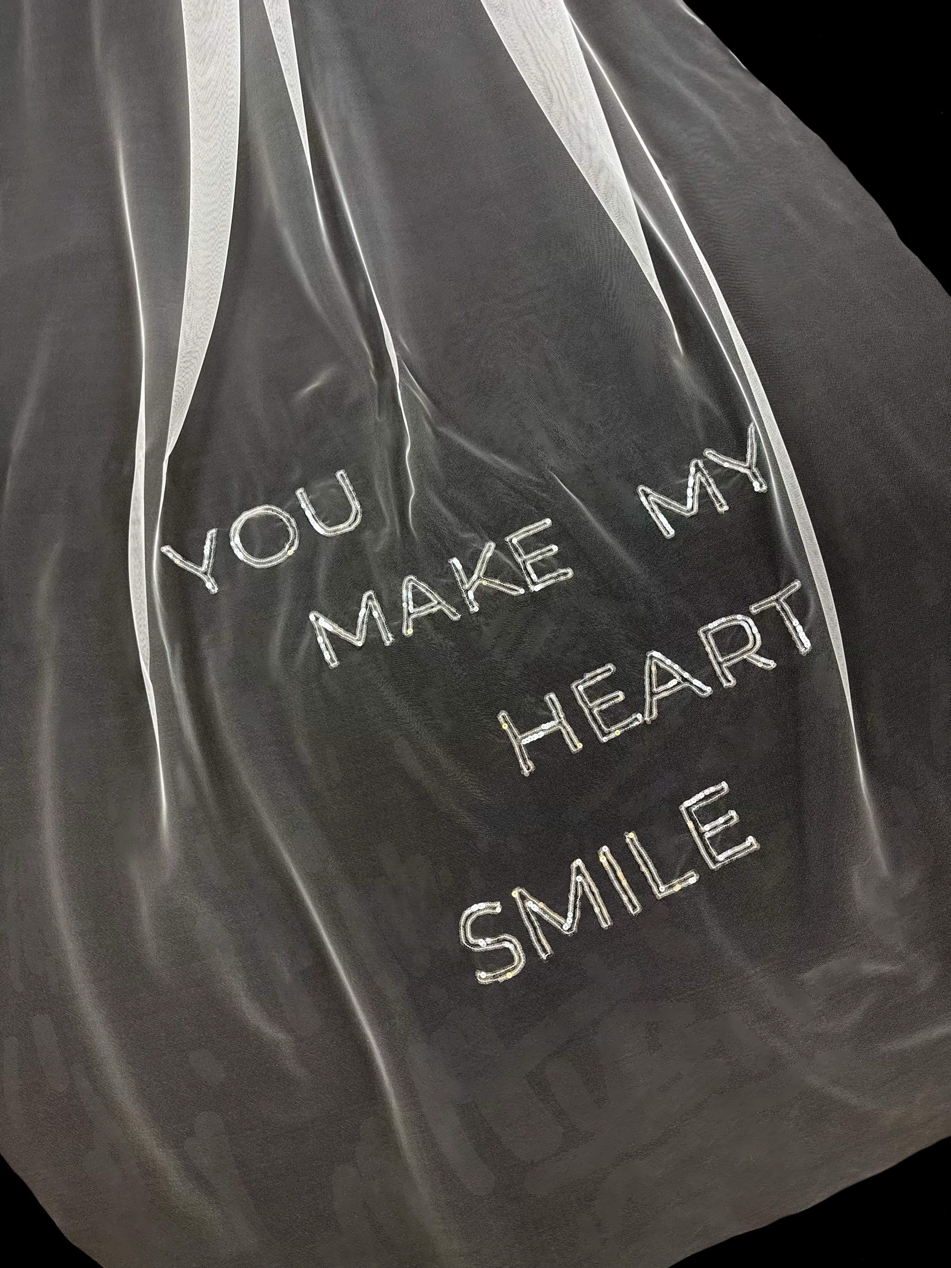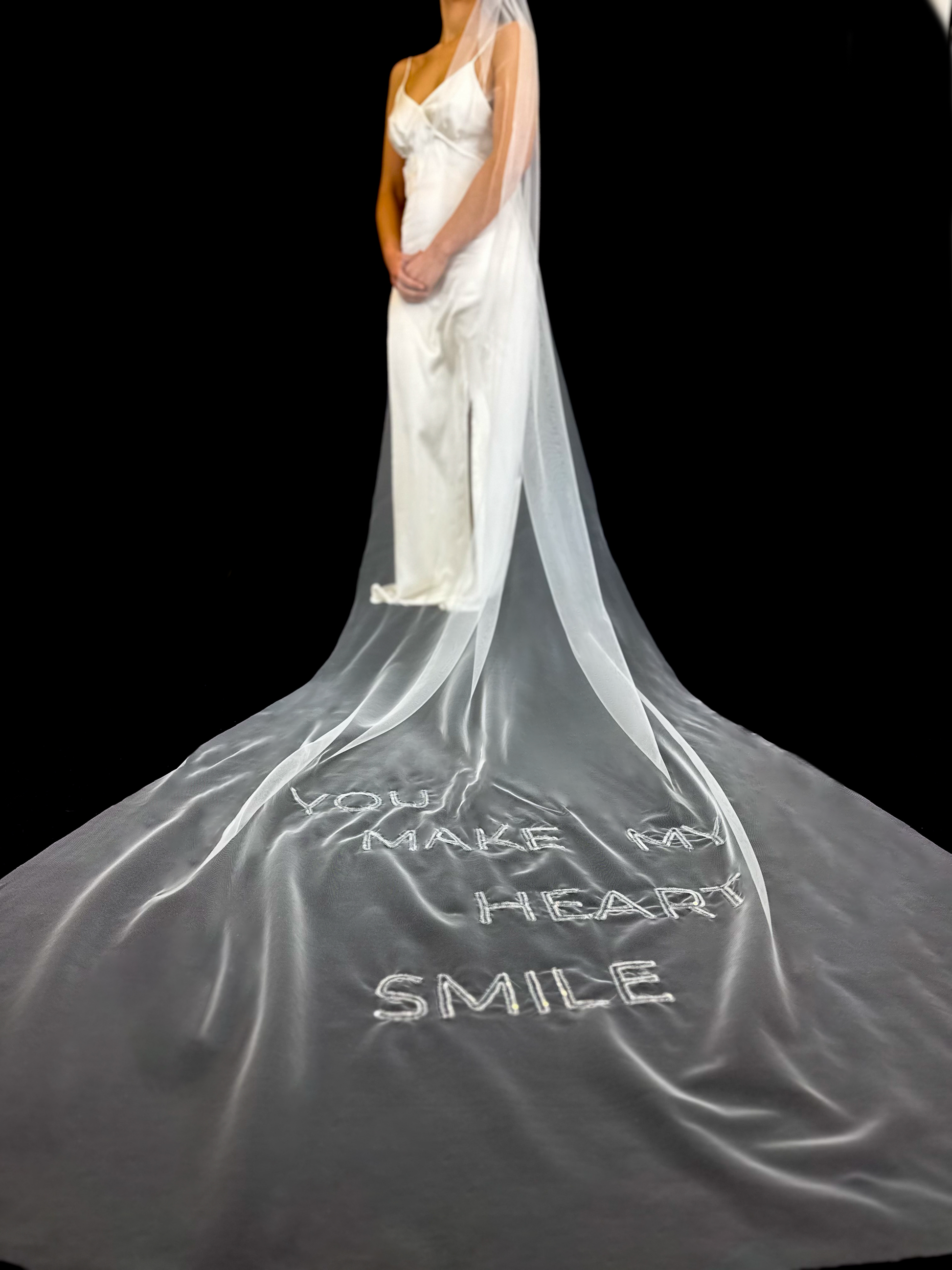Inspiré par l’élégance audacieuse de Pamela Anderson, ce voile de mariée artisanal allie simplicité et modernité. Long et épuré, il se distingue par une inscription brodée à la main avec des paillettes transparentes, capturant la lumière avec délicatesse et raffinement.