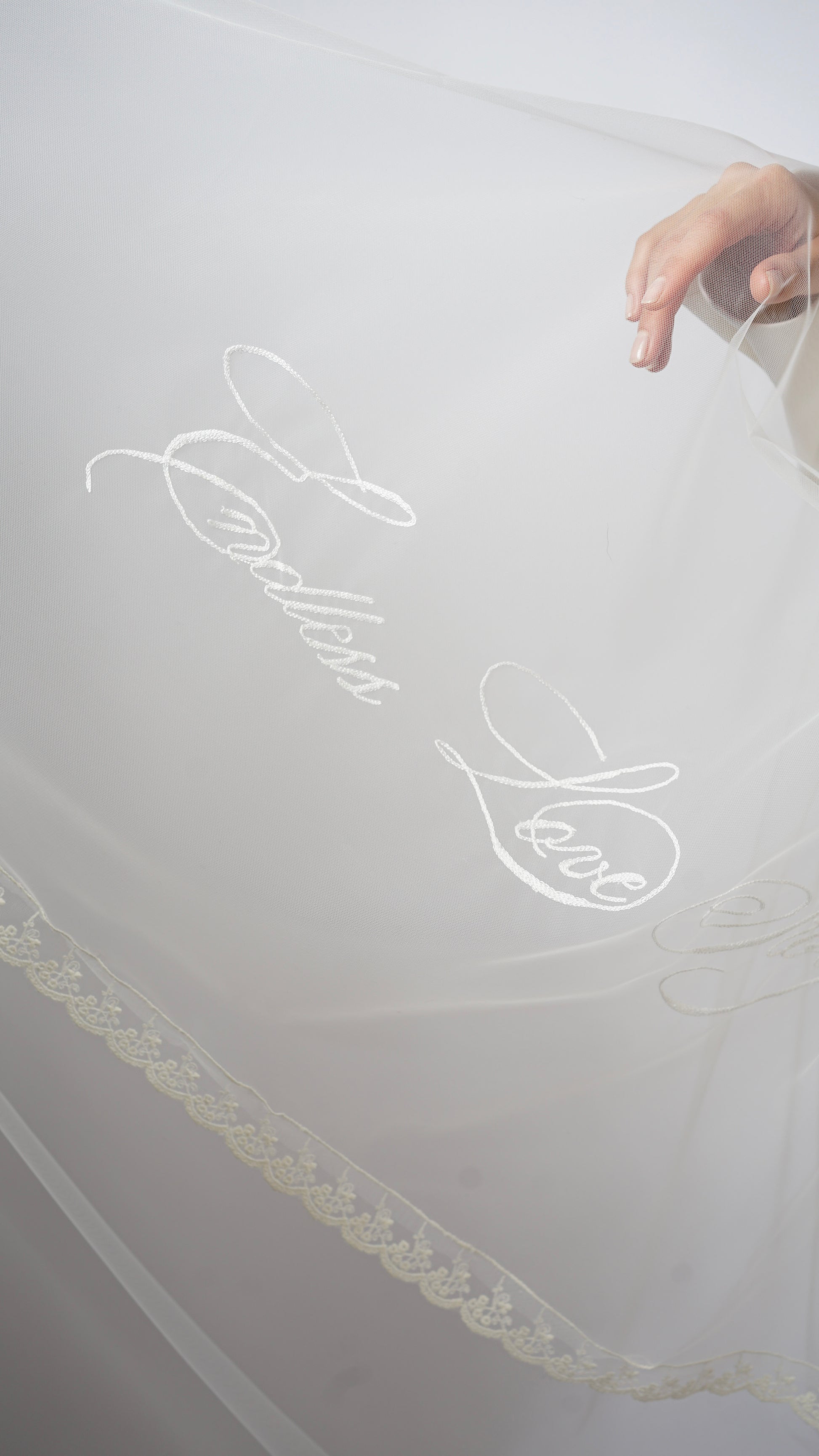 • Broderie personnalisable : possibilité de modifier la phrase à la demande, pour que la mariée fasse passer son propre message, en accord avec son histoire