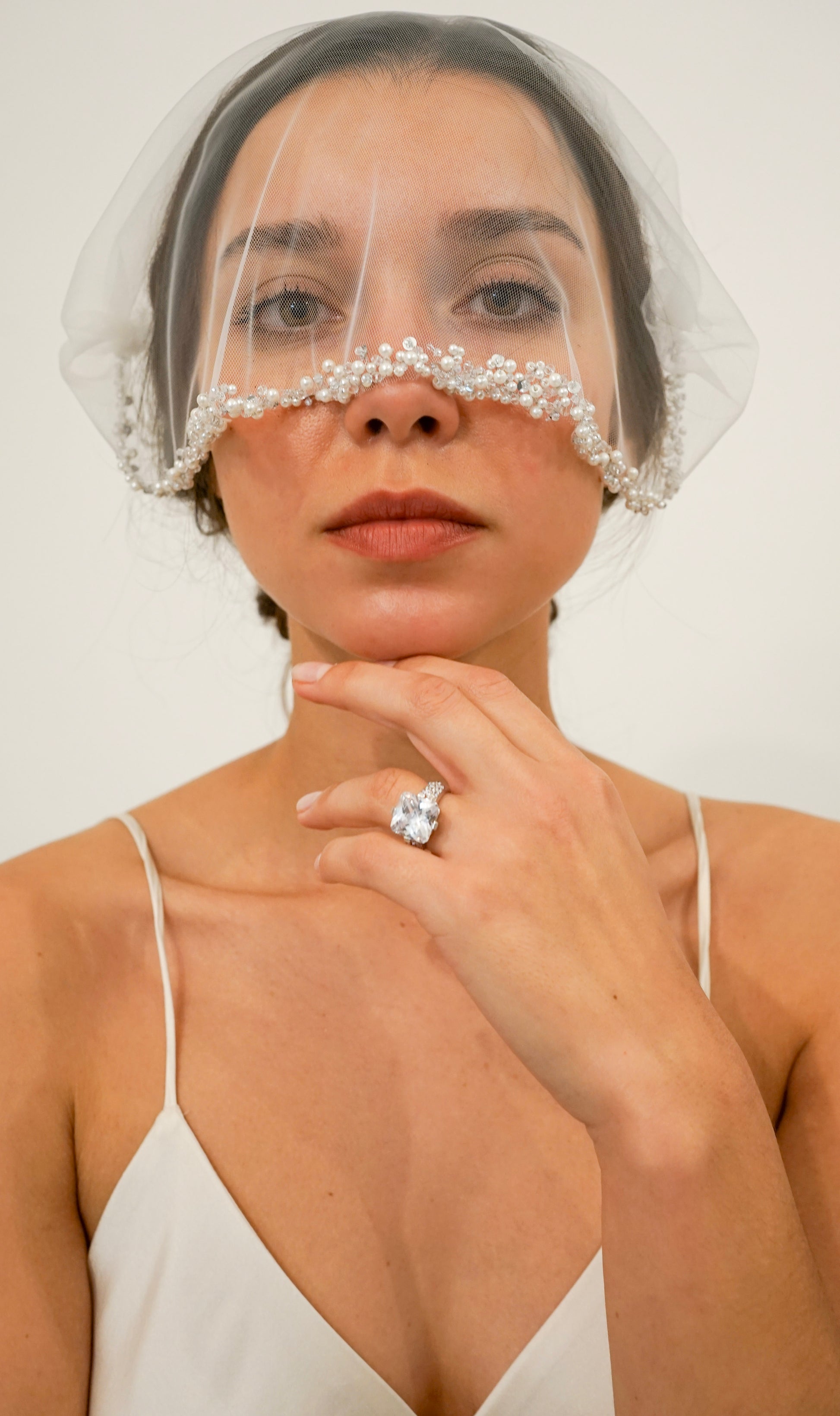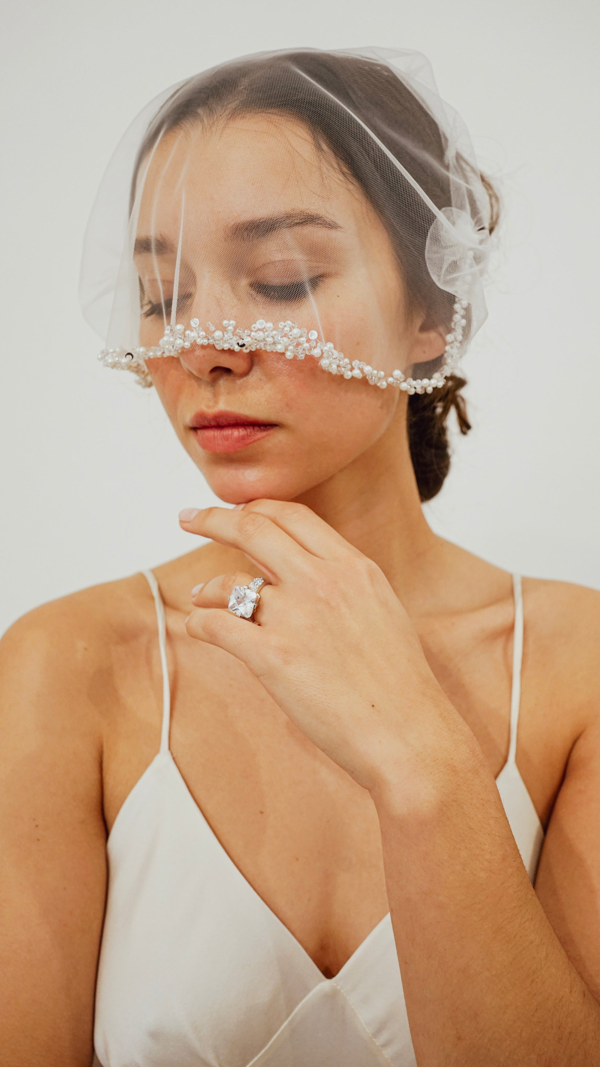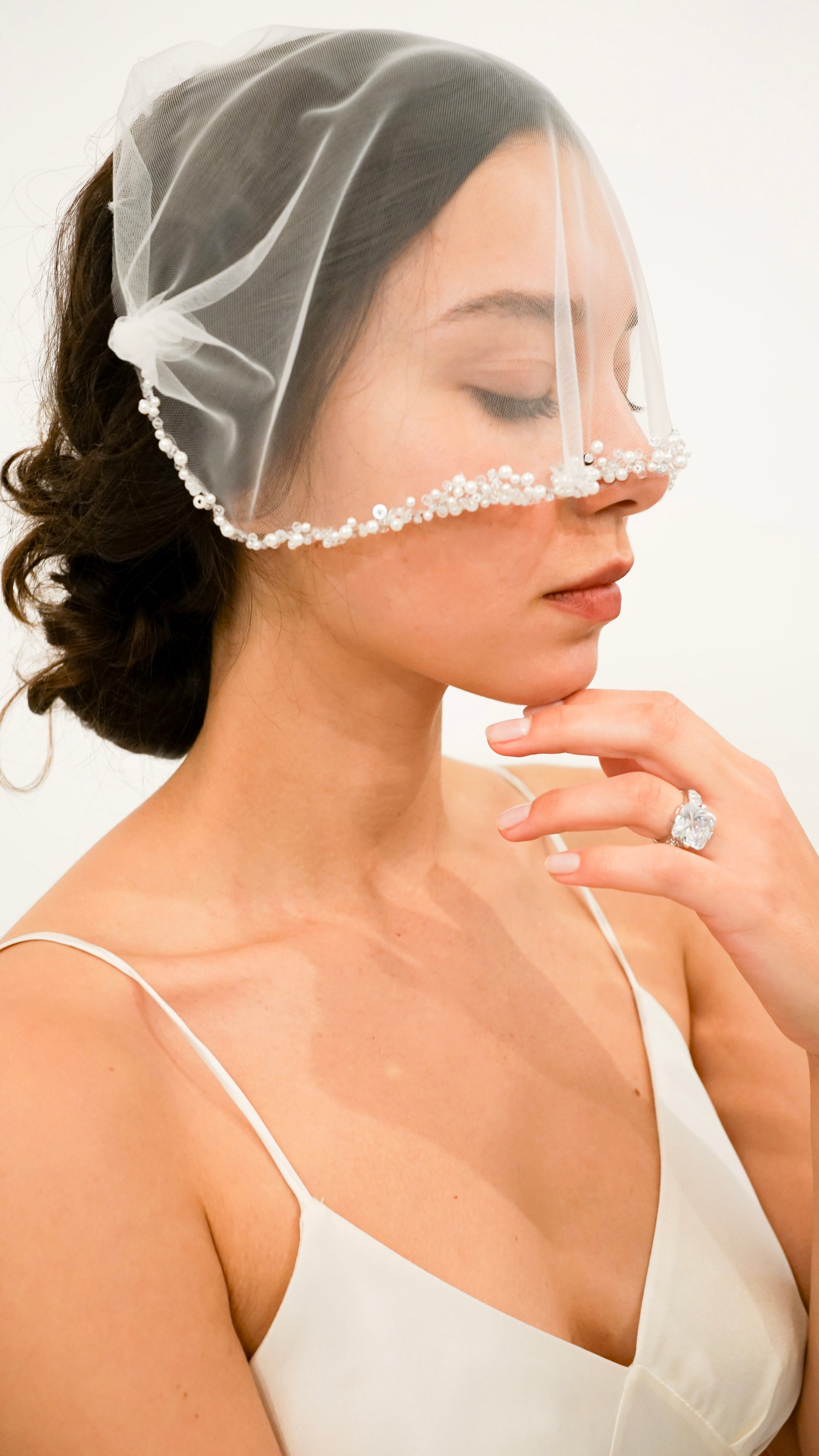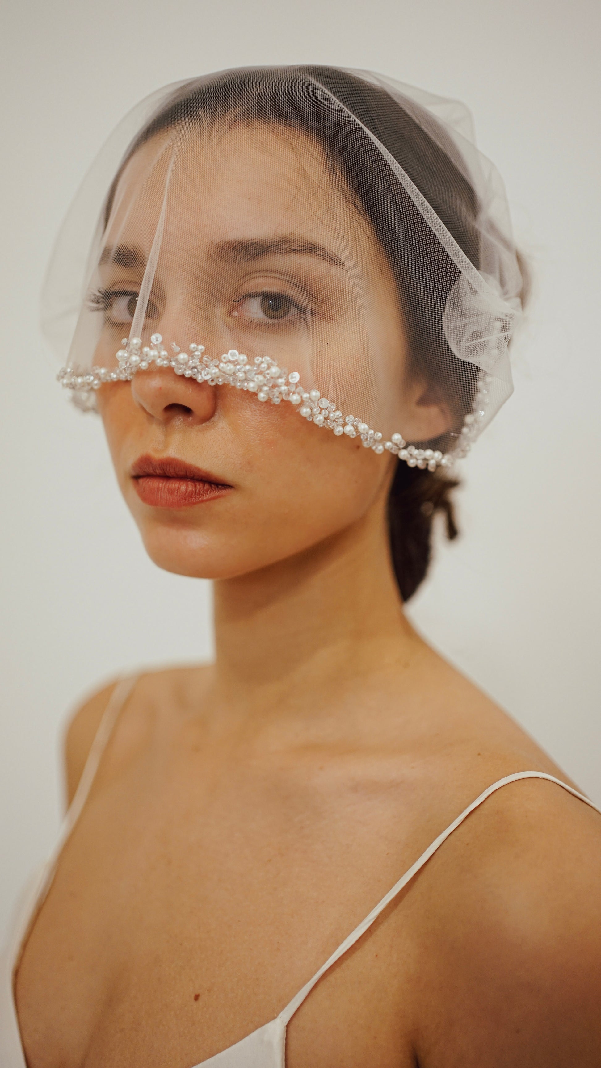 "The Pearl Bar" détient une place particulière dans la collection : c'est la seule voilette ornée de perles. Cette distinction lui confère un caractère précieux, jouant sur le contraste entre la douceur du tulle et la rigueur architecturale de la ligne perlée. Elle est conçue pour la mariée qui cherche une singularité absolue.
